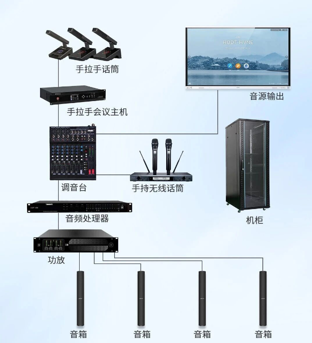1.前级处理设备(以调音台为核心)作为系统信号枢纽,主要承担两大功能:多源混音:支持混合麦克风人声、乐器输入、预录伴奏等多路信号,实现同步播放。其英文名"MIXER"直观体现了混音核心功能。