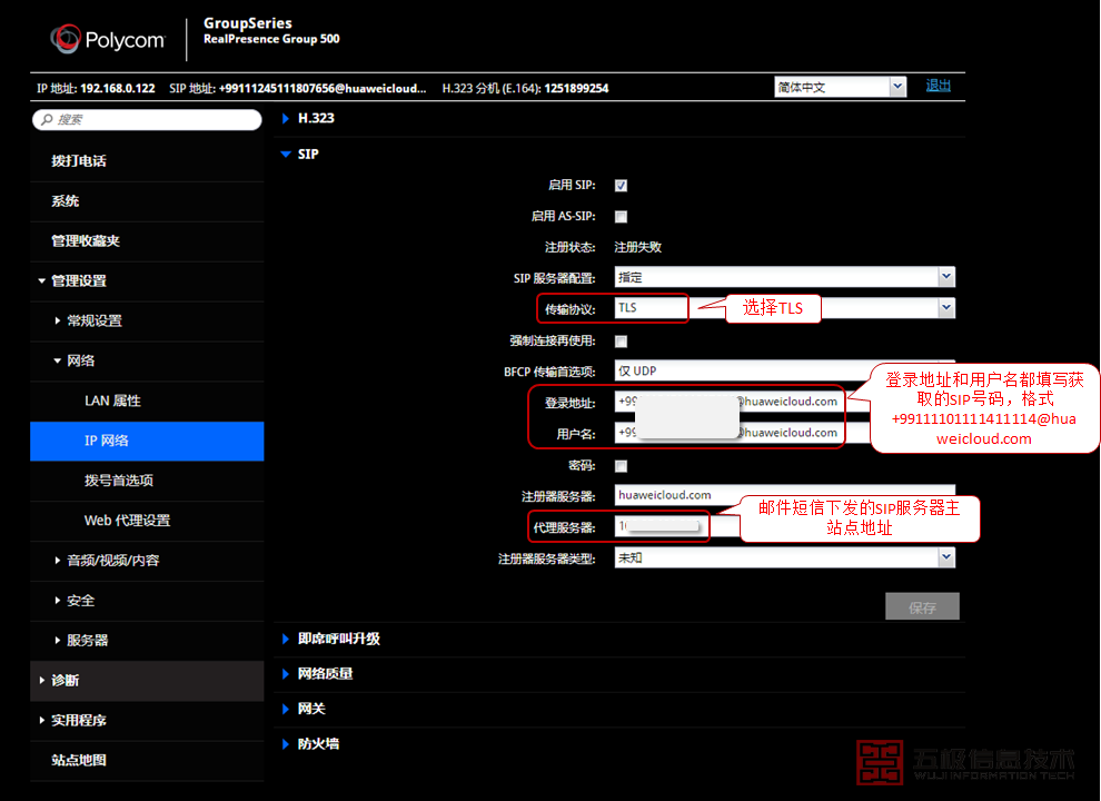 Polycom Group 550终端上配置SIP参数,如图所示:
